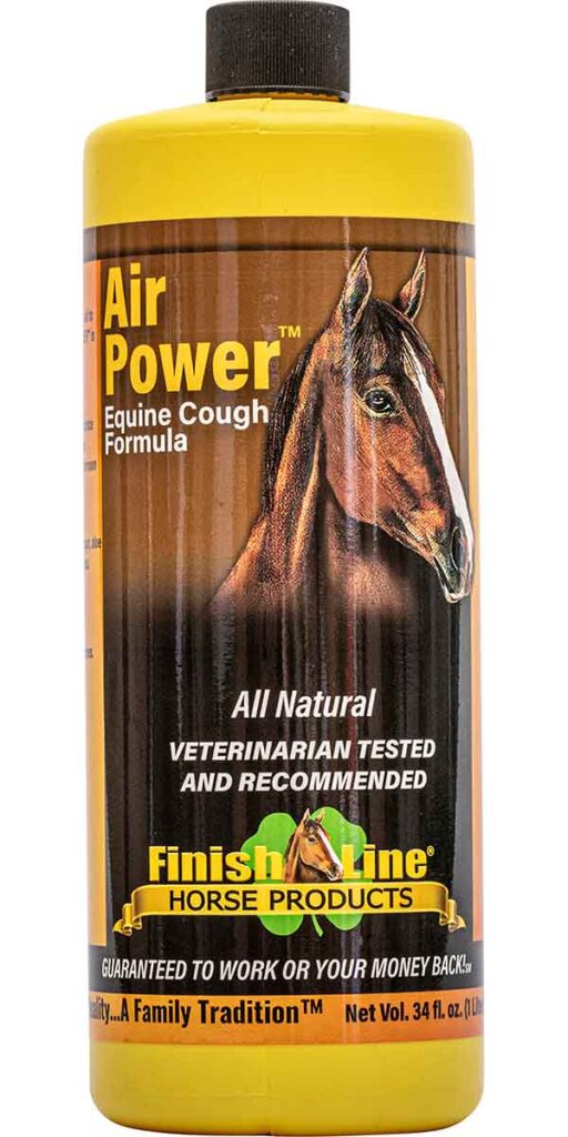 Air Power™ is an all-natural aid in the relief of minor coughs due to irritation. This all natural formula uses ingredients such as Honey, Menthol, Eucalyptus Oil, Lemon Juice, Aloe Vera, Apple Cider Vinegar, and Ethanol to help stop a horse’s cough. Usually one dose of Air Power™ will stop a horse from coughing all day. Safe for pre-event, race, or performances. Air Power™ is cost effective as you only need one fourth as much Air Power™ as you do of most other products.