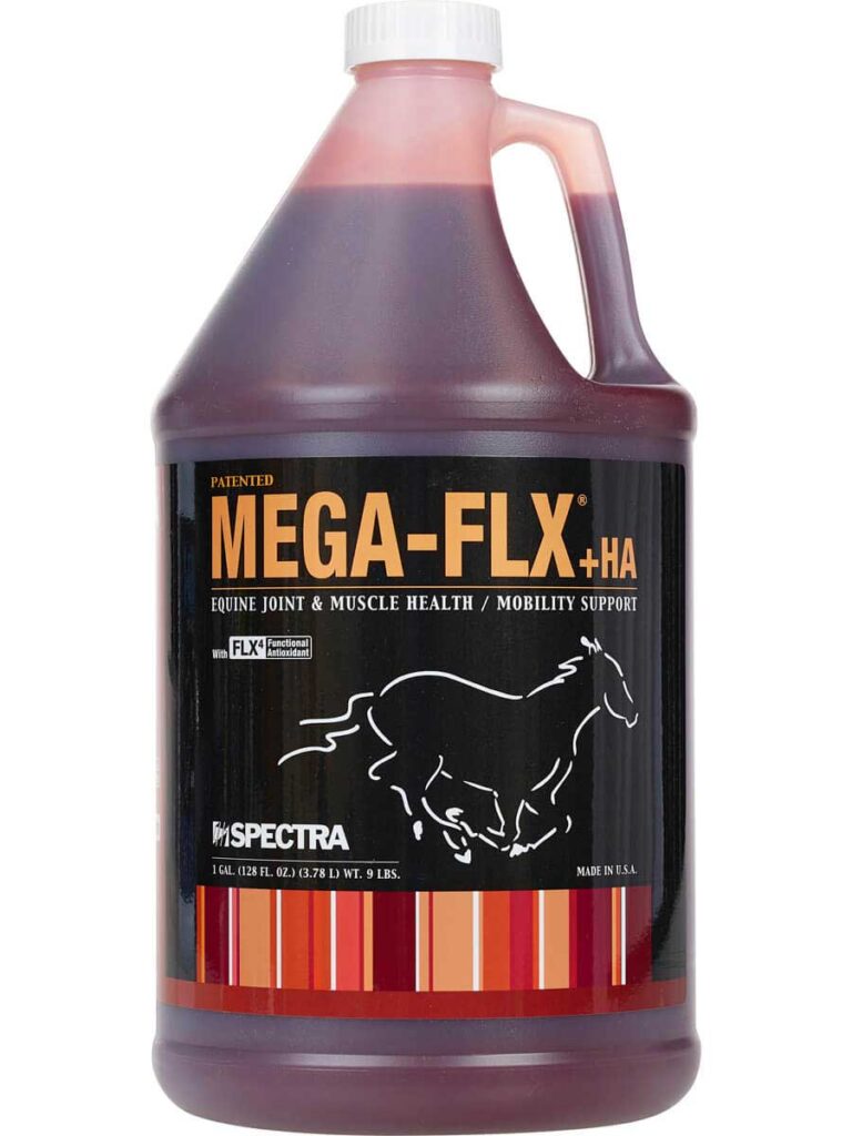 Mega-Flx +HA Equine Sore Muscle & Joint Solution is a patented solution combining our proven selenium and vitamin E absorption system for muscle soreness along with premium key nutrients that promote joint health. Mega-Flx +HA is the only joint supplement to contain FLX4, a proprietary brand of functional antioxidant shown in studies to provide a superior 1.75 average lameness improvement (AAEP’s Lameness Grading Scale). Most joint supplements average only around 1.0. Mega-Flx +HA combines the fast relief of HA and MSM to the long term lameness improvement of our FLX4 ingredient.